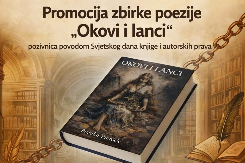 U Narodna biblioteka i čitaonica „Njegoš” Cetinje Vas, povodom obilježavanja Svjetskog dana knjige i autorskih prava, sa posebnim zadovoljstvom poziva na promociju nove zbirke poezije „Okovi i lanci” književnika i publiciste Božidara Proročića, koja će biti održana u četvrtak, 23. aprila 2026. godine, sa početkom u 18 časova, u prostorijama Biblioteke.